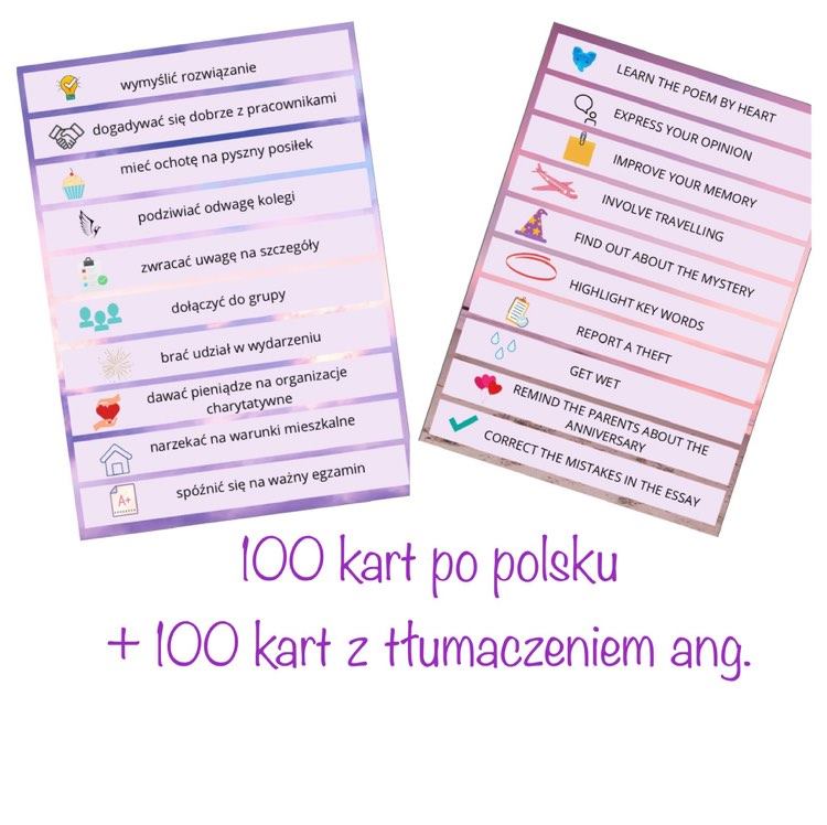 Zestaw składa się ze 100 kart po polsku i 100 kart z odpowiednikami w języku angielskim.